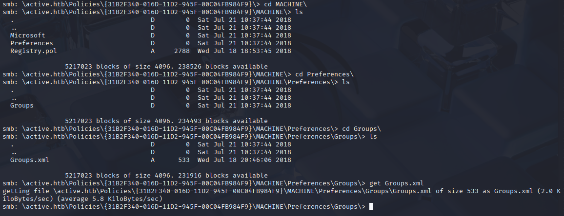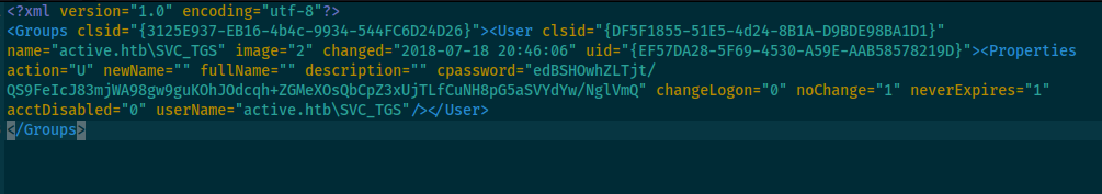\active.htb\Policies\{31B2F340-016D-11D2-945F-00C04FB984F9}\MACHINE\Preferences\Groups\Groups.xml