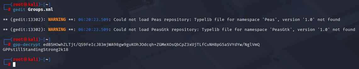 After opening Groups.xml and copy cpassword hash, simply use builtin tool gpp-decrypt to decrpyt password