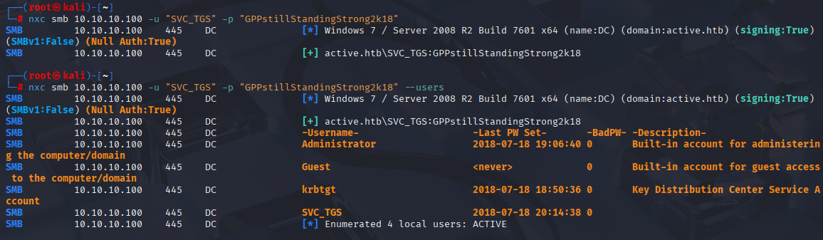 nxc smb 10.10.10.100 -u "SVC_TGS" -p "GPPstillStandingStrong2k18" --users